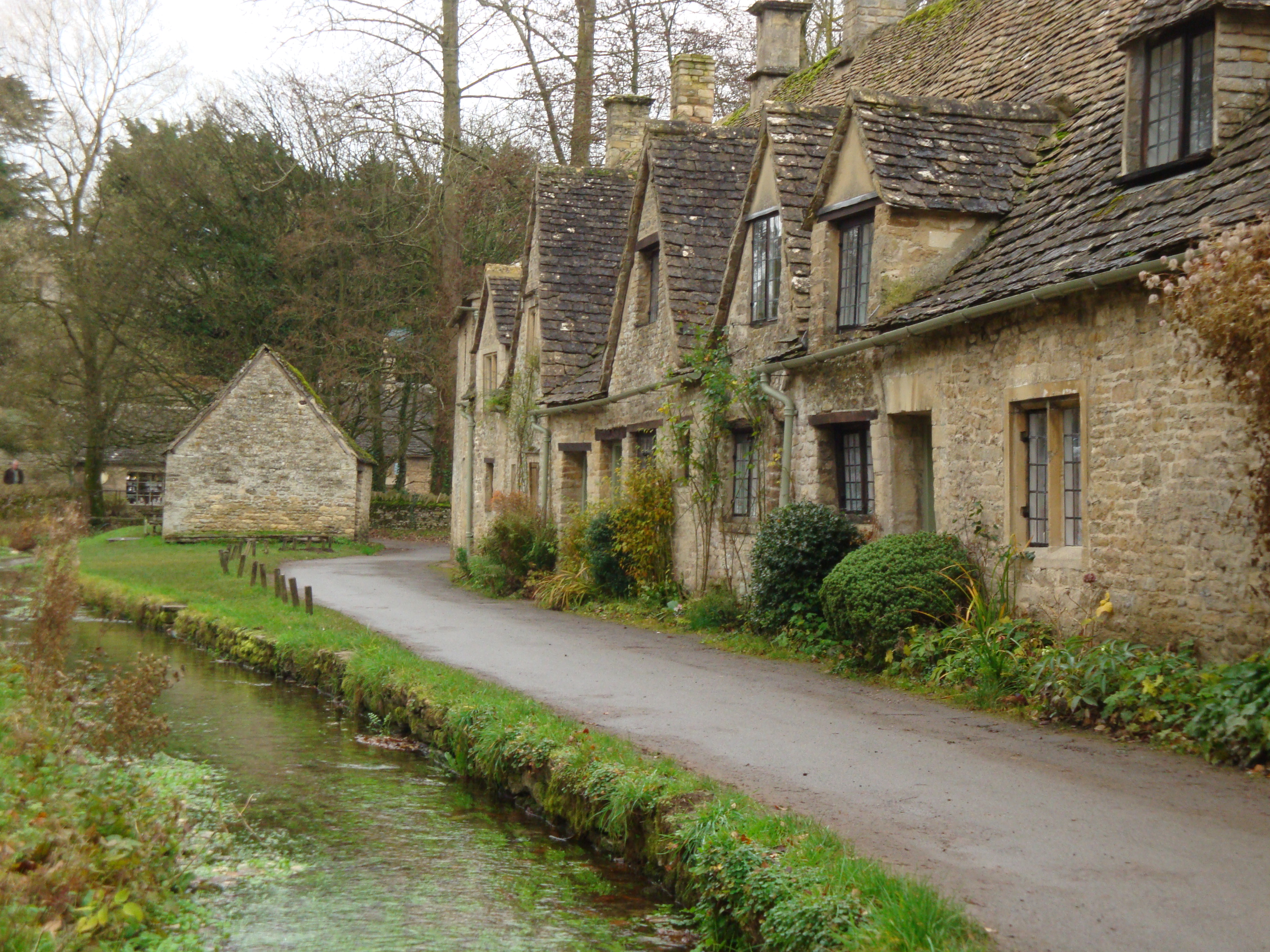- Arlington Row in the beautiful Cotswold village of Bibury. This row of cottages was built in 1380 as a monastic wool storage and converted to weavers’ cottages in the 17th century. They are incredibly picturesque, and are probably the most photographed scene in all of the Cotswolds. The adjacent water meadow is a protected habitat for many species of water-loving plants and birds. The last time we were there my husband and I saw a kingfisher flitting along the river. It was a crisp winter day and the scent of wood smoke drifting from the cottage chimneys mingled with that of damp leaves and grass. We enjoyed an unhurried cream tea at the William Morris tea room and a quiet stroll through the village. A woman rode a white horse down the main road while a yellow Labrador gamboled at their heels. There was a peaceful, unhurried feeling entirely absent during the frenzied summer months