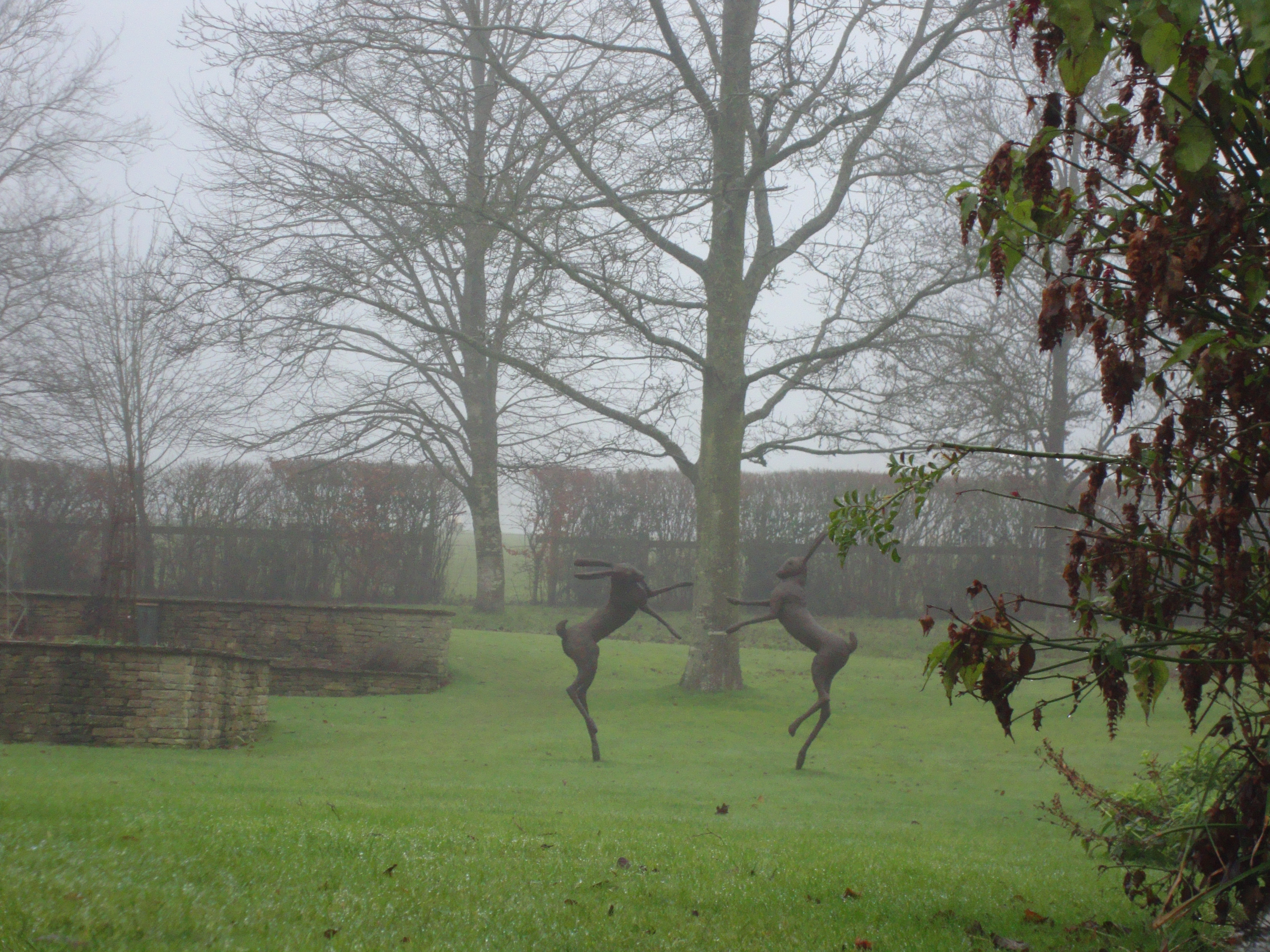 After Stratton we continued across fields and alongside streams to the very charming little village of Daglingworth. Here we came across another ancient church with a large, square house next to it which overlooked quite a pretty garden. We shamelessly lifted our cameras up above the hedgerow to take photos of the long reflecting pool and the sculpture of dancing hares before continuing down the lane to pause on the bridge above the stream.