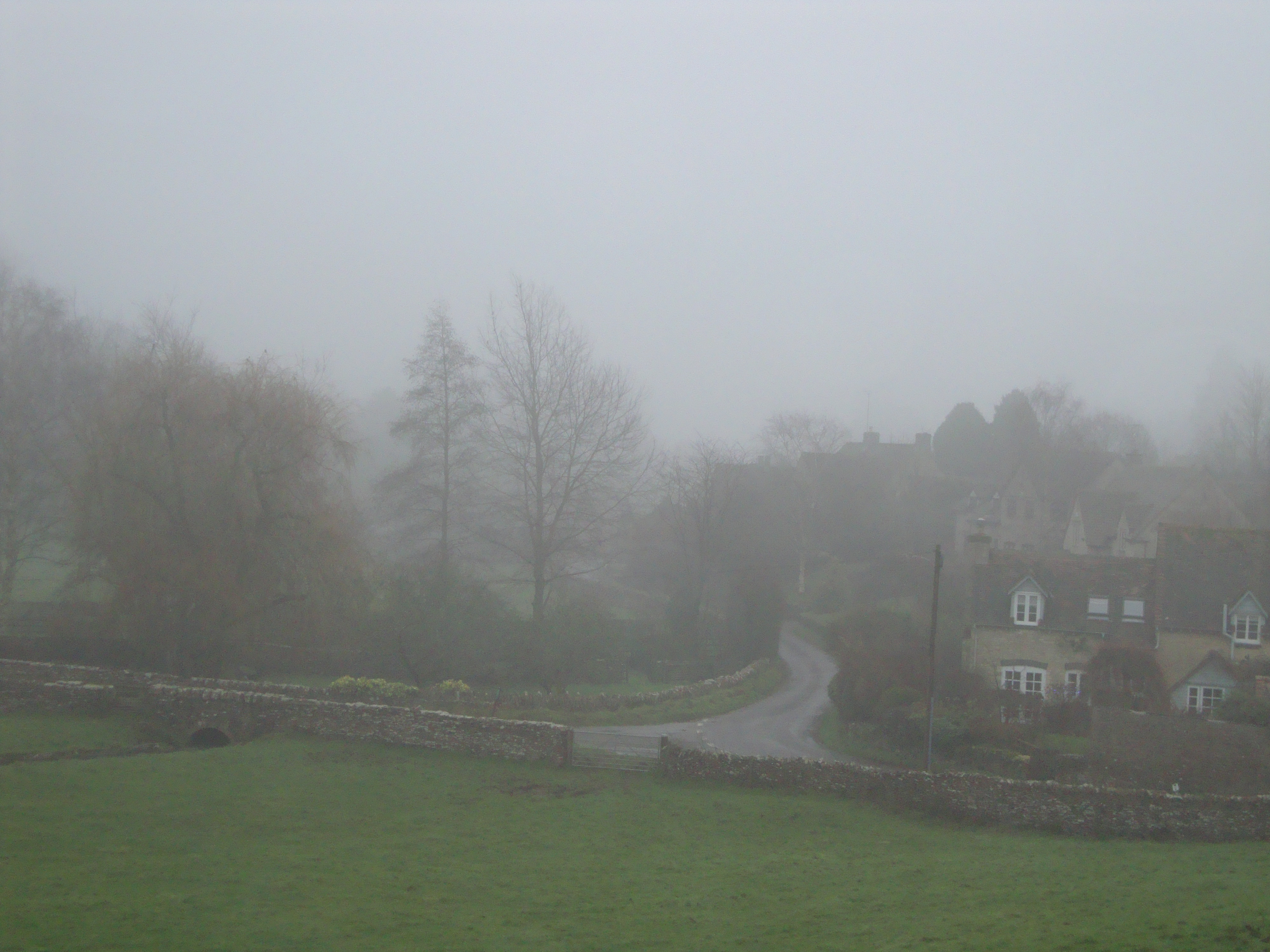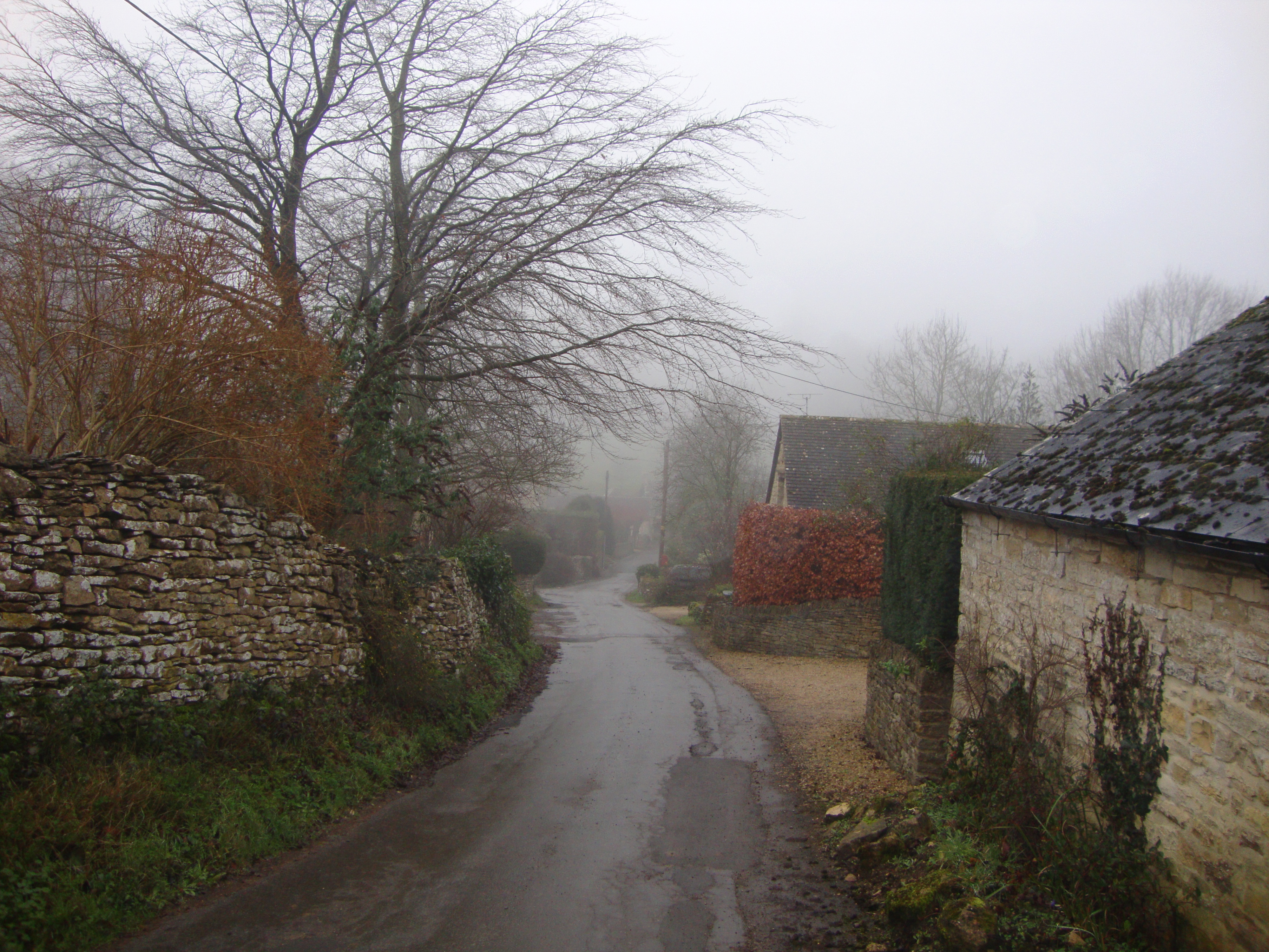 At last we abandoned the footpaths and walked along the narrow, one-track lane which led toward Duntisbourne Leer. We encountered no one as we walked through the fog-shrouded villages. Perhaps they were all just smart enough to be staying indoors by a warm fire rather than trotting about the countryside on a cold December day, but it did give us the odd feeling of walking through a forgotten land where all the inhabitants had fled. Only the occasional whiff of wood smoke drifting from a chimney gave evidence of life. This is an area where, as my husband says, it takes a lot of dosh to be able to afford to live, so perhaps they had all traveled to Switzerland for some skiing or Bermuda for some sunshine over the holidays. Whatever the reason, we could have been walking in the Outer Hebrides for all the people we saw. We rather enjoyed the feeling of solitude. It was peaceful and quiet, with only the chattering of birds to accompany our occasional conversation.