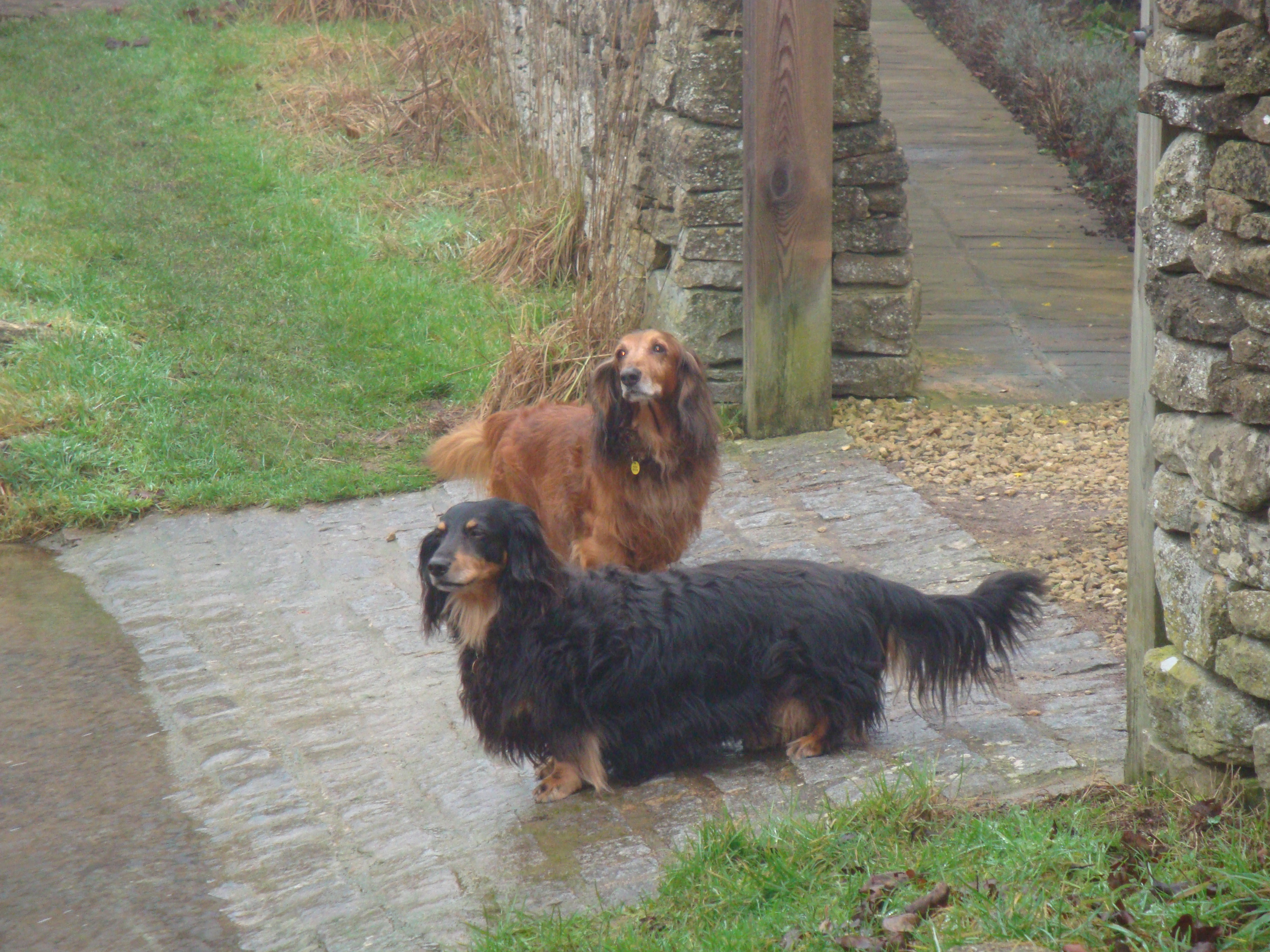 When finally we reached it the village of Duntisbourne Leer proved to be just as abandoned. No one peered from behind a lace curtained window; no one leered unpleasantly at us from a dark doorway. The only life we encountered were two elderly long-haired Dachshunds who did their best to stand in for the Hound of the Baskervilles by growling and barking lustily from the safety of their driveway. Their fierceness was belied by their swiftly wagging tails and the happy little hops they gave when I told them how brave they were.
