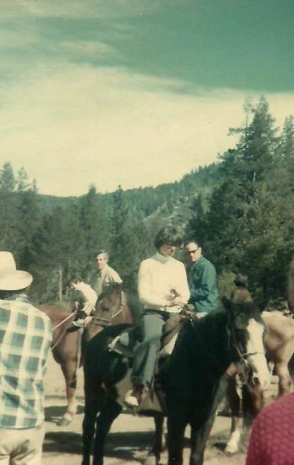 Then there was the trail ride we eagerly coerced our parents into taking us on during a stay at Lake Tahoe. I was the only one too young still to ride a horse on her own, so I was assigned to share with my father. He’s a tall man, so the horse he was given was quite tall as well. I remember being lifted up, up, up and placed in the saddle in front of my father. It was a Western saddle with a large pommel, and I felt rather like John Wayne in the movies when I casually rested my hand there and surveyed the world so far below me. If only there had been some cattle to rope I probably would have felt capable of roping them, so great was my feeling of confidence as I sat there with my father protectively holding onto me.